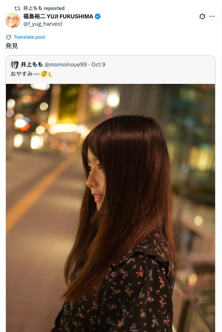 井上ももさんの写真集を担当したカメラマンである、福島裕二さんとX上で絡みもあったので、ご本人である可能性は高いでしょう。