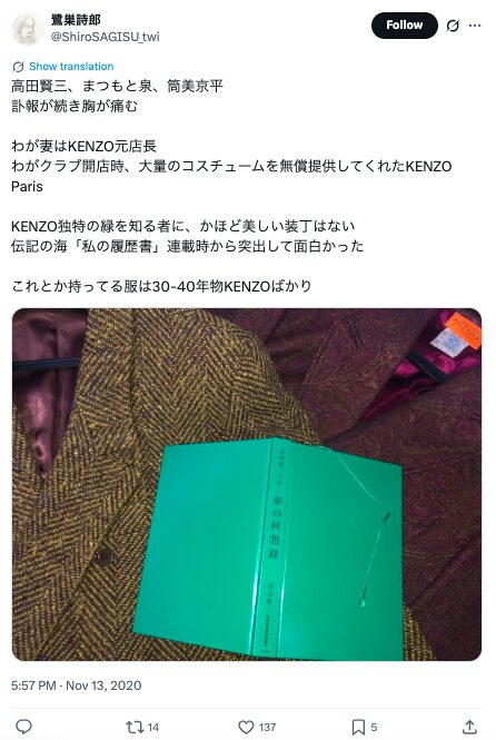 鷺巣詩郎さんは、パリでクラブ「SHIRO」を経営されていたことがあるのですが、その際に無償で大量のコスチュームを提供してくれたというエピソードを投稿されていました。