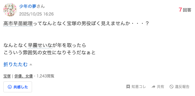 実際に、Yahoo!知恵袋にも、高市早苗さんが宝塚の男役っぽく見えないか?という質問もありました。